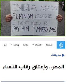 كذلك هو الحال مع الحركة النسوية، والصورتان في اليسار تعبران عن ذلك. في الأولى احتجاج من نسوية هندية على دفع المرأة للمهر، وفي الثانية احتجاج من نسوية عربية على تلقي المرأة للمهر، بل وتعتبر المهر -في مقالها- (تسليع للمرأة).